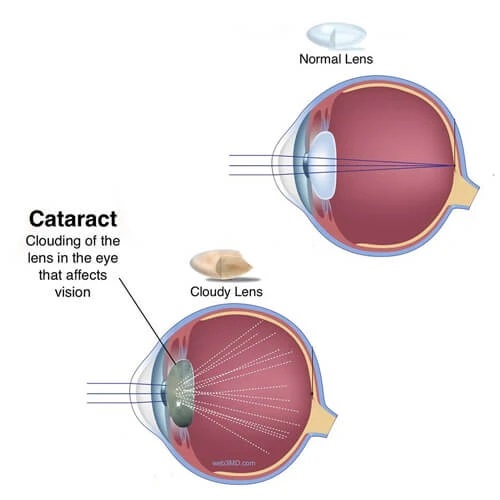 A cataract is a clouding of the lens in the eye, which affects the person’s vision. The lens of the eye is located behind the iris (the colored part of the eye) and the pupil and its main function is to focus light onto the retina, which is responsible for sending visual signals to the brain. In a healthy eye, the lens is clear, but in a person with cataracts, the lens becomes cloudy, causing the light passing through it to scatter and preventing it from reaching the retina properly. This can cause a wide range of vision problems, including blurred vision, glare, and difficulty seeing at night. Cataracts are a common condition, especially in older adults. It is caused by the aging process of the lens, but can also be caused by injury, disease, or certain medications. Cataract can be treated by surgically removing the cloudy lens and replacing it with an artificial one called an intraocular lens (IOL). This is a very common procedure and it is safe and effective in improving vision.